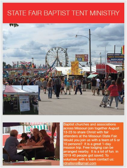 We want to thank the State Fair team and leaders of associations across Missouri who sent folks to work at the Baptist Tent at the state fair this past August 8-18 in Sedalia.